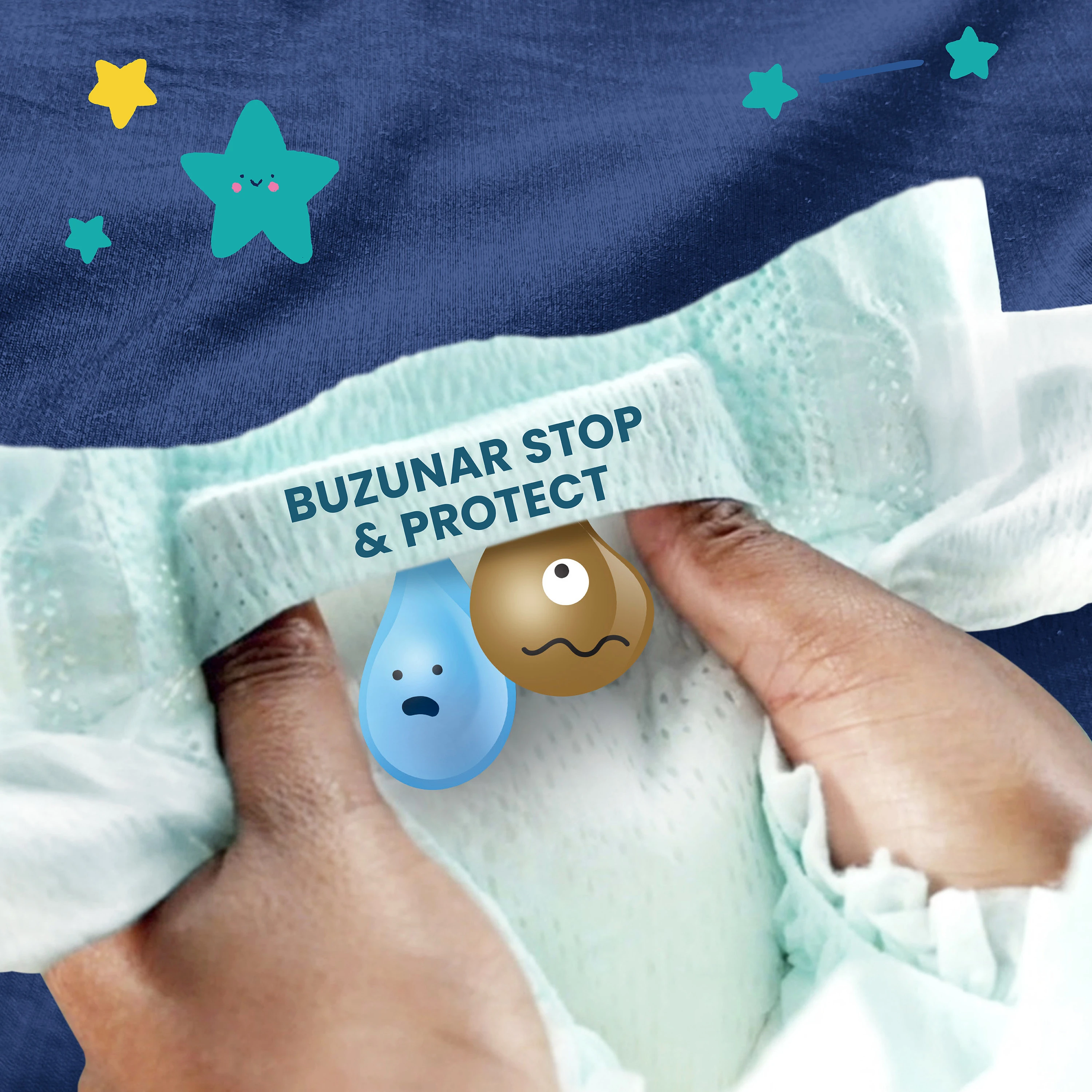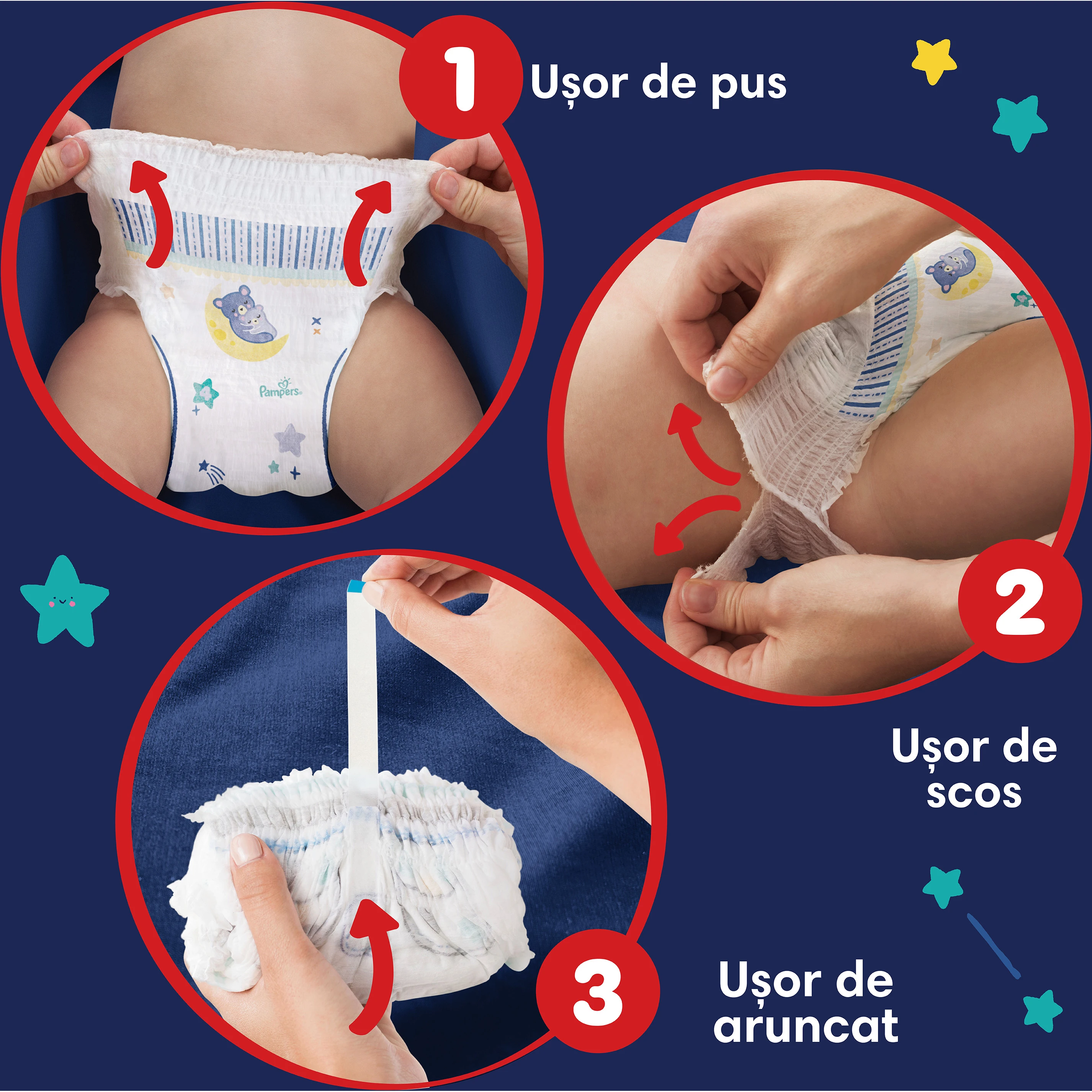 Ночные трусики Pampers обеспечивают более надежную защиту для спокойного ночного сна благодаря усовершенствованному внутреннему слою, который мгновенно впитывает влагу на срок до 12 часов, а также имеют инновационный кармашек Stop & Protect, который предотвращает протекания сзади.