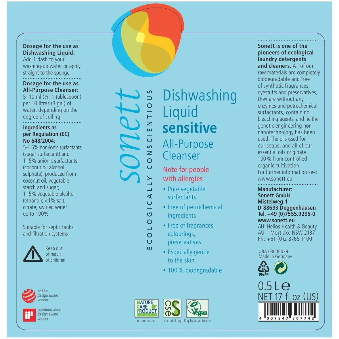 Универсальное средство Sonett – бережное к коже, эффективно в уборке — это экологичное многофункциональное средство, идеально подходящее для всех задач по уборке дома. Оно мягко воздействует на кожу, включая чувствительную, и безопасно для окружающей среды, сочетая натуральные растительные компоненты с высокой эффективностью в удалении жира и загрязнений.