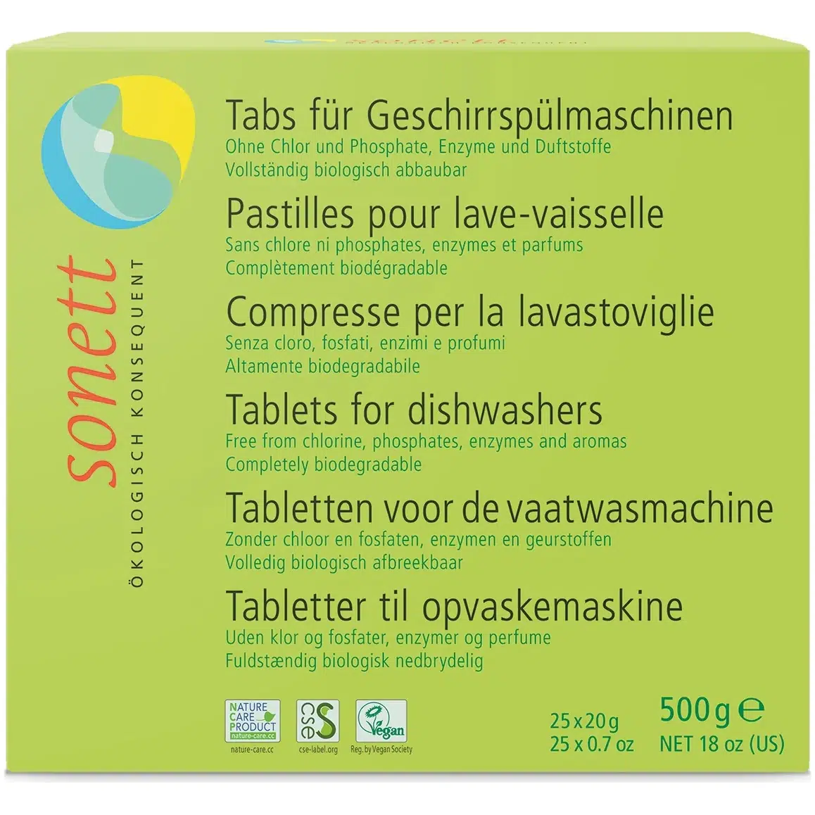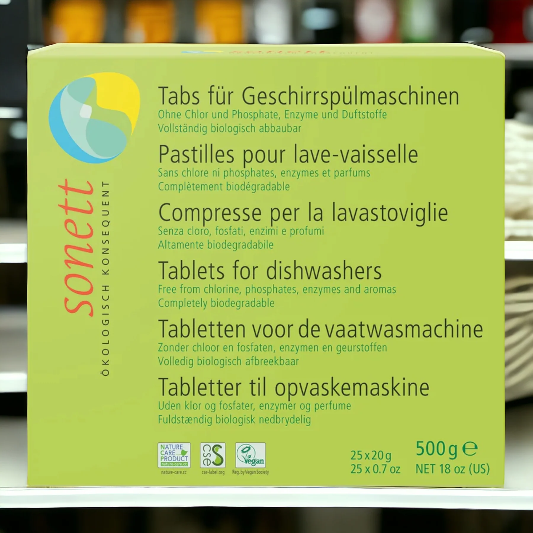 Основными активными ингредиентами таблеток Sonett для посудомоечных машин являются карбонат натрия, силикаты и сульфатированное касторовое масло. Силикаты получают путем сплавления песка с карбонатом натрия и благодаря своей щелочности способны изменять жир на посуде путем омыления, делая его растворимым в воде. Эти силикаты вызывают разбухание засохших остатков пищи, облегчая их удаление. Карбонат натрия, производимый из поваренной соли и извести, диспергирует жир в мелкие капли, поддерживая способность силикатов растворять жир. При добавлении небольшого количества сульфатированного касторового масла поверхностное натяжение воды снижается, и грязь легче смачивается водой. Сульфатированное касторовое масло, также называемое “турецкое красное масло”, получают путем прямой реакции касторового масла с серной кислотой. Кроме того, таблетки содержат кислородный отбеливатель (перкарбонат натрия). Во время цикла мытья перкарбонат натрия выделяет кислород, а также воду и карбонат натрия. Освобождающийся кислород служит для удаления остатков чая и кофе со стаканов и чашек. Перкарбонат натрия является молекулярным комплексом, получаемым путем адсорбции перекиси водорода на карбонате натрия. Цитрат, получаемый путем ферментации побочных продуктов, содержащих сахар (например, мелассы), добавляется в средство для связывания извести в воде и защиты машины от накипи. Так как, несмотря на встроенные ионообменники (умягчители воды), многие посудомоечные машины все еще используют слишком жесткую воду, действие цитрата усиливается известь-связывающими свойствами глюконата натрия, карбоксиметилинулина и тетранатриевого глутамата диацетата. Глюконат натрия является натриевой солью глюконовых кислот, которые естественным образом содержатся в меде и фруктах. Карбоксиметилинулин получают путем карбоксиметилирования инулина, извлекаемого из корней цикория. Тетранатриевый глутамат диацетат на 86% состоит из возобновляемых природных продуктов, содержащих крахмал и сахар.