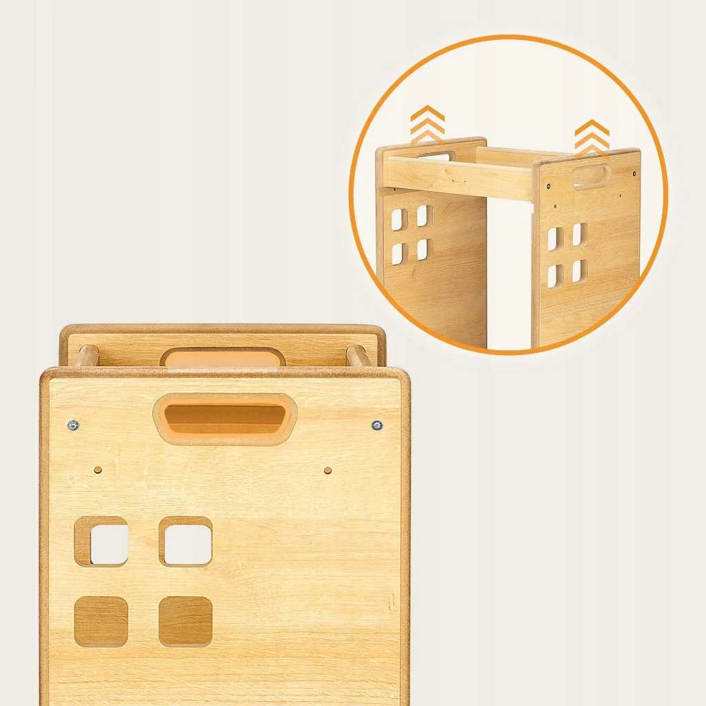 Это многофункциональный и устойчивый мебельный помощник, созданный по принципам методики Монтессори. Он помогает ребёнку безопасно участвовать в повседневных делах на кухне, а когда малыш подрастает — превращается в удобную детскую библиотечку. Один предмет мебели, который растёт вместе с ребёнком и служит годами!